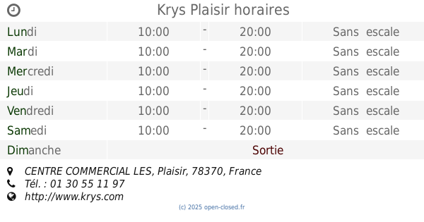 Add it to your website, your phone or even your desktop - opening times, phone numbers and the road to Store of the Krys Dans Plaisir, CENTRE COMMERCIAL LES.